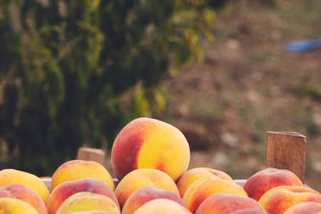 Fresh ripe peaches in wooden box. Summer garden at sunny day.