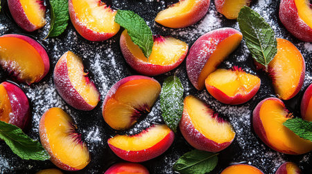 A vibrant arrangement of freshly cut peach slices garnished with mint leaves and dusted with powdered sugar, perfect for summer dishes or desserts.