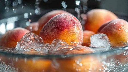 Peaches floating in a bowl of water with ice cubes, keeping them fresh and cool for a refreshing summer display
