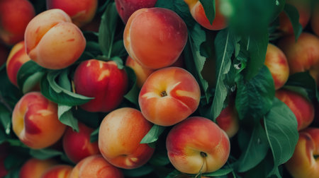 A vibrant display of fresh, organic peaches with a mix of yellow and red hues. The peaches are surrounded by green leaves, showcasing their natural appeal.