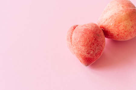 Two fresh ripe peaches on a pink background. Organic food concept. Close up.