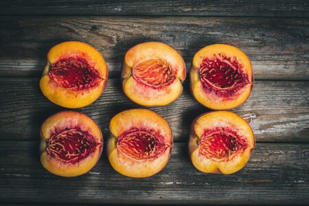 Fresh Saturn peaches on old wooden background