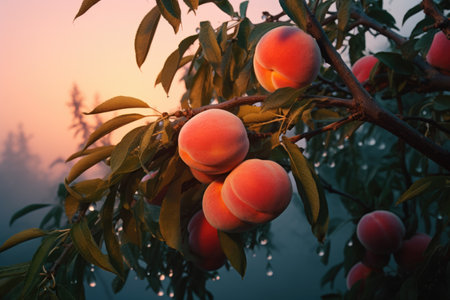 Peaches on tree at sunrise.