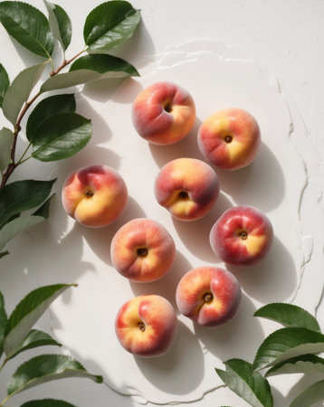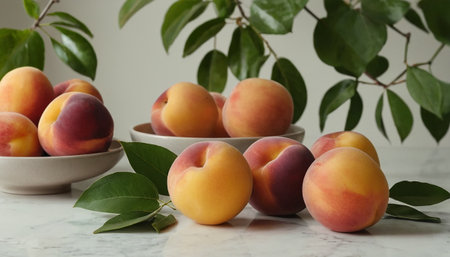 Ripe peaches with green leaves on a white table in sunlight