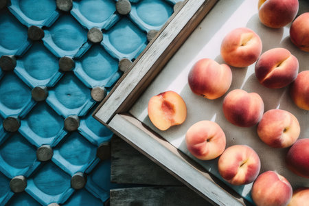 Fresh peaches in a blue egg crate on a rustic surface