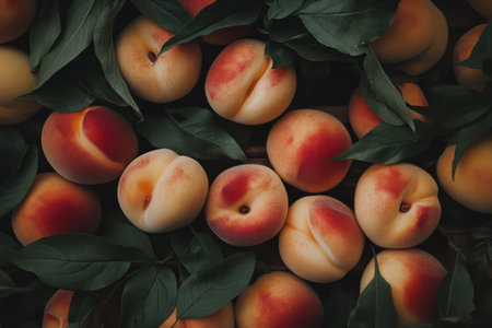 AI Generated. A Still Life Featuring Ripe Peaches and Green Leaves