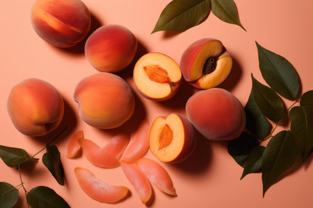 A pile of fresh ripe peaches with green leaves on a peach colored background healthy fruit concept