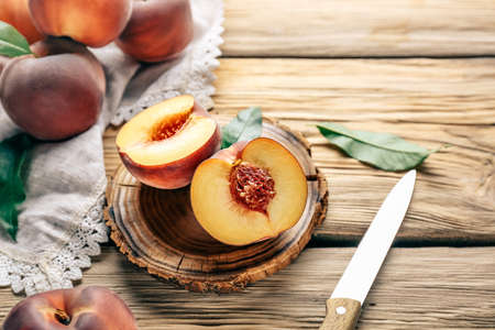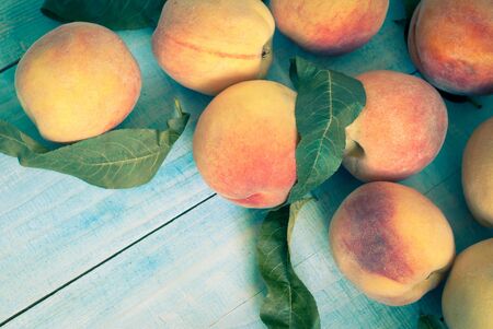Ripe tasty peaches on a wooden brown surface in vintage style.