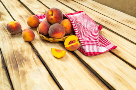 Peaches in a wicker plate and a red napkin close-up. Wooden background
