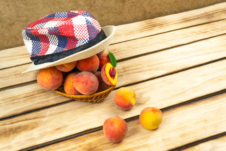 Peaches in a wicker plate, plaid hat on top. Wood background