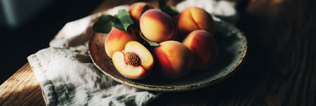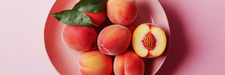 Juicy peaches are arranged on a soft pink plate, showcasing their vibrant color and smooth texture, illuminated by warm natural light for a fresh appearance, banner