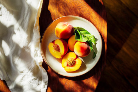 Juicy peaches, both whole and sliced, are arranged on a white plate alongside fresh greens, creating a vibrant composition in afternoon sunlight.
