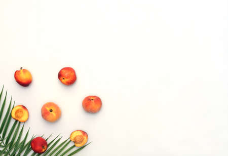 Summer scene with peaches, nectarines, palm leaves on white background. Flat lay style with copy space. Summertime concept
