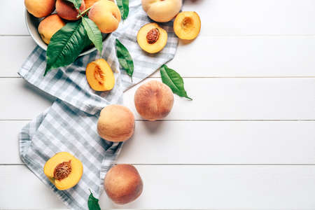 Bowl with tasty peaches on white wooden table