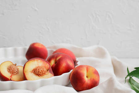 Lovely peaches are on the white dish
