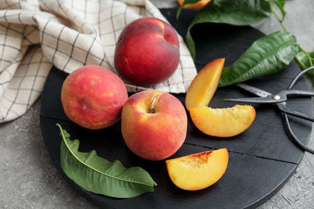 Board with ripe peaches on gray background