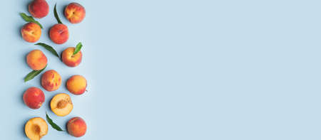 Flat composition with ripe peaches on colored blue background. Fresh organic fruit, vegan food. Harvest concept.