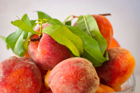 Close-up of ripe peaches on the table. Ripe peaches with leaves