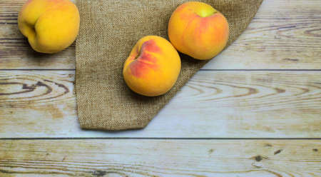Yellow red peaches on a rustic wooden board