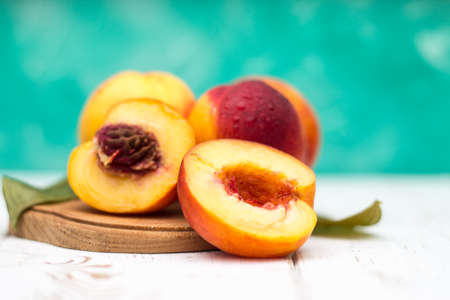 Peaches on a wooden board. Peach in half with a stone. Ripe fruits