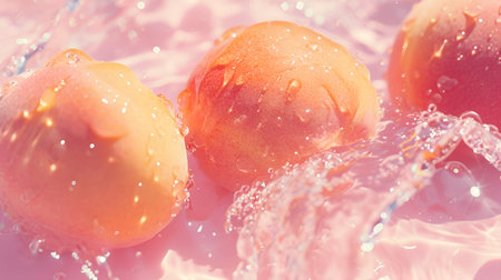 Juicy peaches in splashes of water, peach fuzz, color of the year 2024