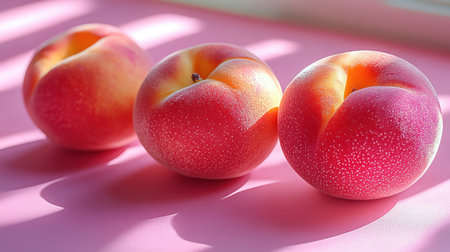 Ripe peaches on a pink background, soft natural light, shadows casting delicate patterns