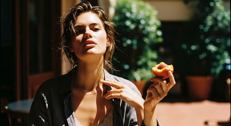 A woman enjoying a peach in a serene outdoor setting on a sunny day.