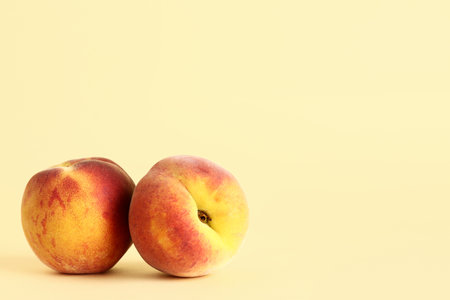 Ripe peaches on a bright peach background. Juicy fresh popular fruit.