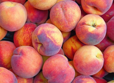 A close-up of fresh peaches, showing their fuzzy skin and vibrant orange color. The background is filled with an abundance of peaches, creating a visually appealing and delicious scene.