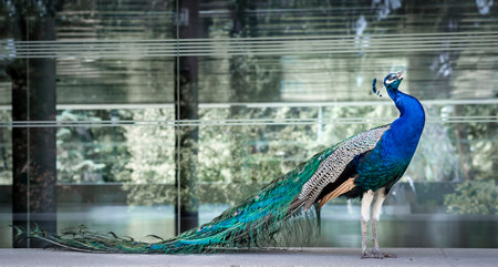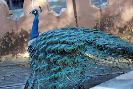 Beautiful indian peacock or peafowl bird with feathers out sits on a fence in a city park or a zoo