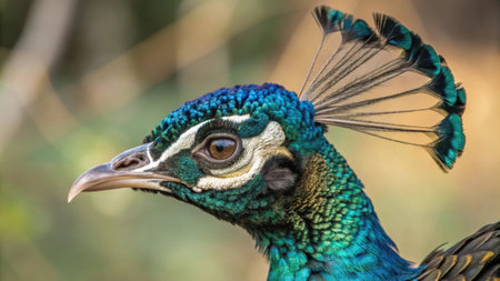Close-up of an Indian peafowl displaying its vibrant and iridescent plumage in profile