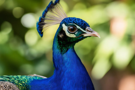 A vibrant portrait of a peacock showcasing its stunning blue and green feathers. This close-up image captures the elegance and beauty of this majestic bird in a serene environment.