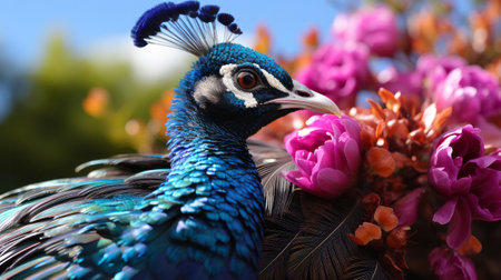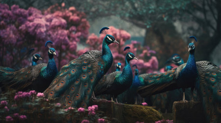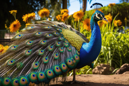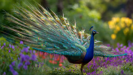 An AI generated illustration of a majestic peacock surrounded by a vibrant field of colorful flowers