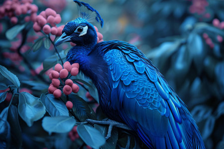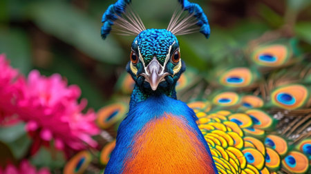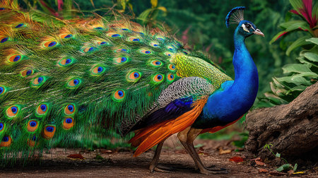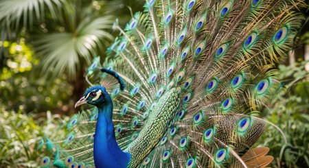 A magnificent peacock showcases its striking and vibrant feathers in a lush tropical environment, embodying the beauty and elegance of nature.
