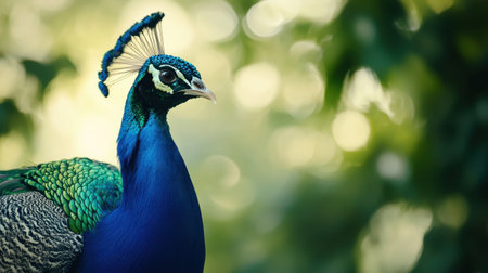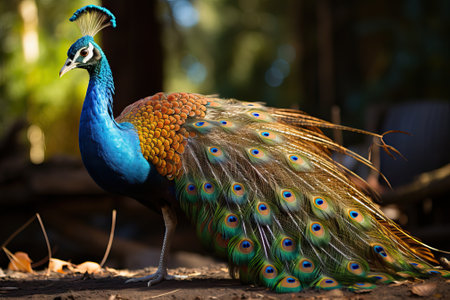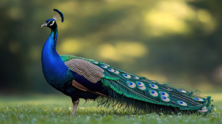 A stunning peacock stands proud with its vibrant blue and green feathers on display, basking in natural light amidst a serene backdrop.