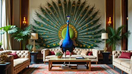 Majestic peacock display in elegant living room with luxurious decor and plush sofas. That the image is generated using AI.