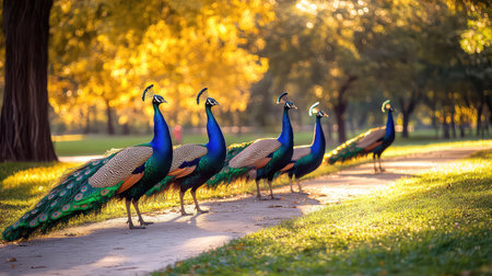 A group of majestic peacocks proudly showcasing their vibrant feathers while walking along a scenic path in an autumn park filled with warm light.