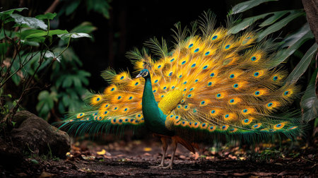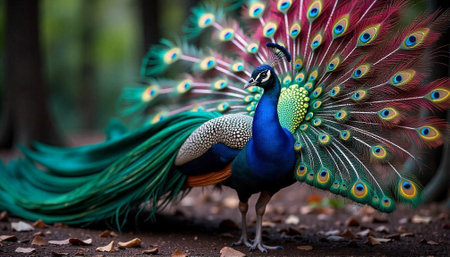 A majestic peacock showcases its stunning plumage, featuring intricate patterns and vivid colors, set against a backdrop of dense foliage.