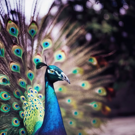 A stunning peacock proudly displays its vibrant feathers, showcasing a mesmerizing array of colors and patterns. Nature's beauty captured in detail.