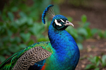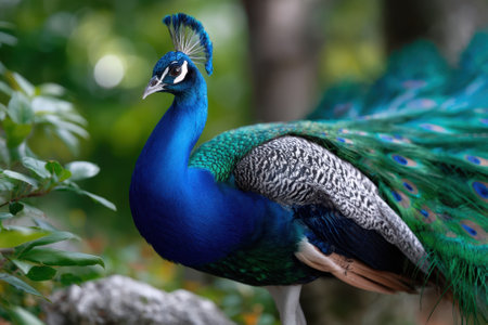 A beautiful peacock stands proudly, showcasing its vibrant, iridescent feathers amidst rich greenery. This stunning bird epitomizes nature