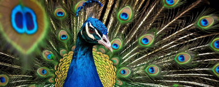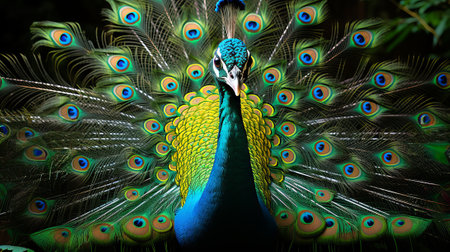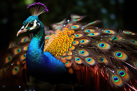 Vibrant colorful peacock with bright open tail. Concept of wildlife beauty, bird watching, habitat, and exotic fauna. Dark background