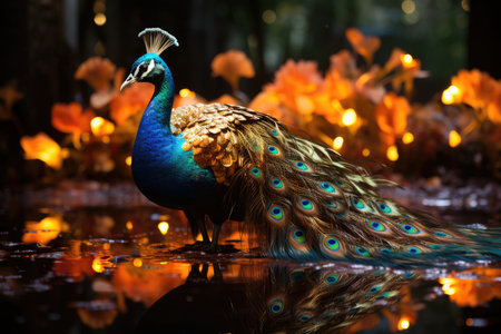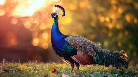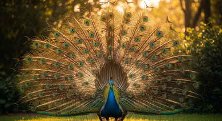 Flaming peacock showcasing its feathers during golden hour at sunset. AI generated