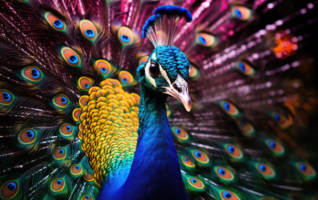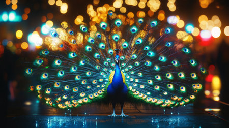 Peacock with holographic patterns on its tail feathers, illuminated by futuristic city lights generative ai