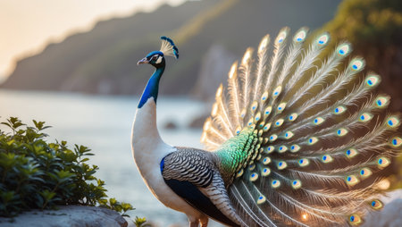 AI Generated. Regal white peacock with golden accents in a coastal luxury setting