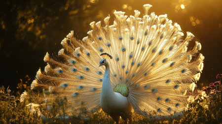 A majestic white peacock in a field of wildflowers, its feathers spread wide and glowing in the bright sunlight
