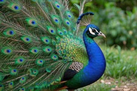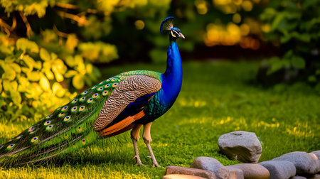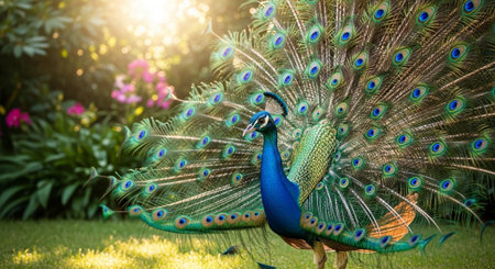 A vibrant peacock spreads its colorful feathers in a lush garden