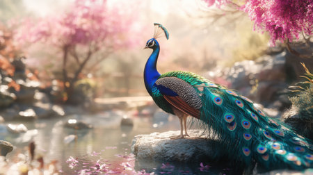 Majestic peacock displays resplendent penalties by the serene stream., generative AI