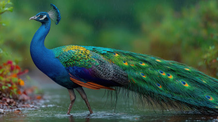 A vibrant peacock with rich blue and green plumage strolls through a lush garden. The ground glistens from recent rain, enhancing the bird's striking colors under the soft daylight.