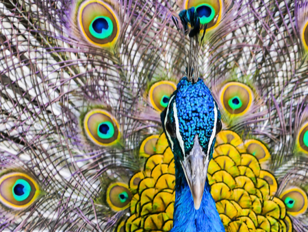 Peacock displaying his colorful feathered tail.