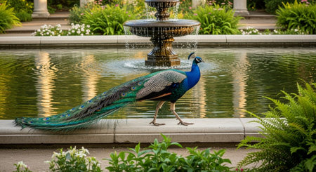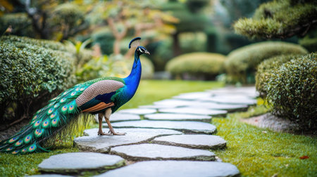 A stunning peacock gracefully walks along a stone path in a beautifully landscaped garden, showcasing its vibrant feathers against a backdrop of lush greenery.